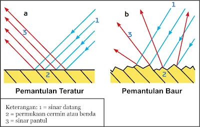 Sedangkan pemantulan baur adalah pemantulan cahaya yang terjadi pada permukaan yang tidak rata. Misalnya pemantulan cahaya pada air, batu, pohon, dan aspal.